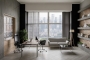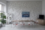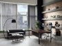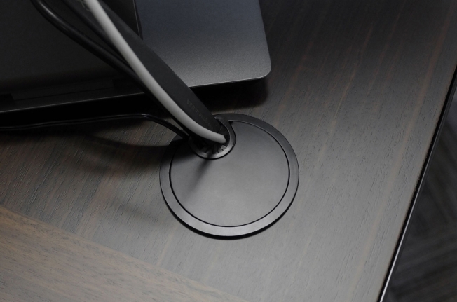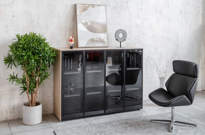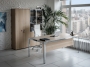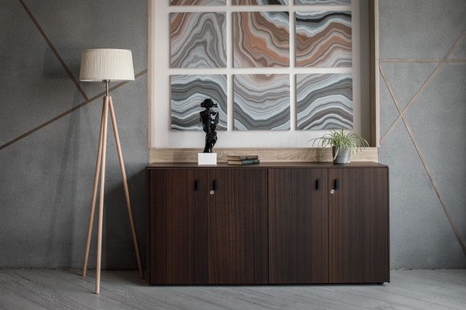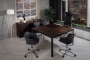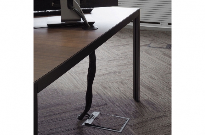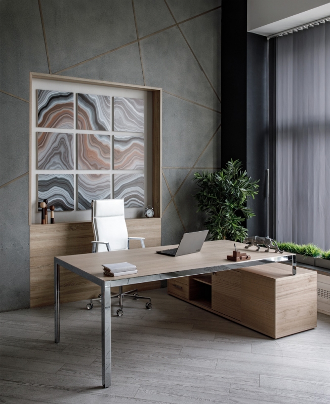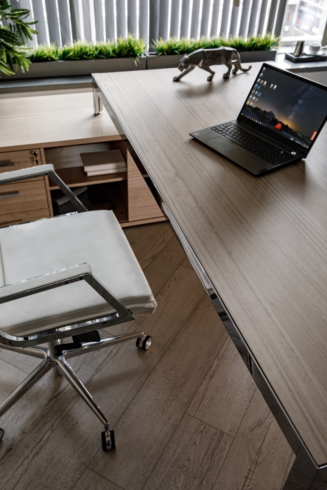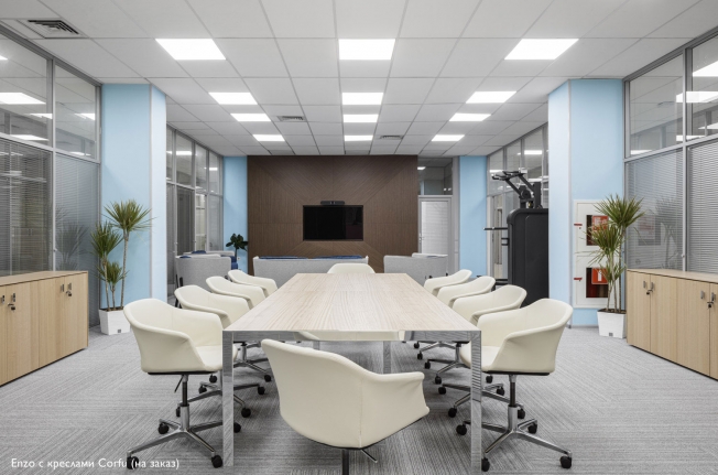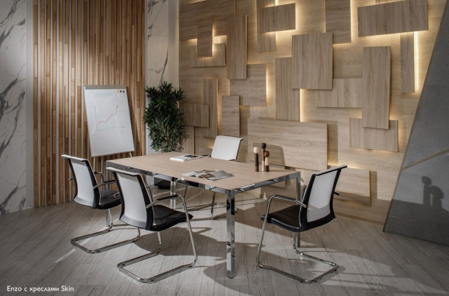 Квадратный переговорный стол с динамичным разнонаправленным шпоном призван стать центральным элементом и главным героем пространства.