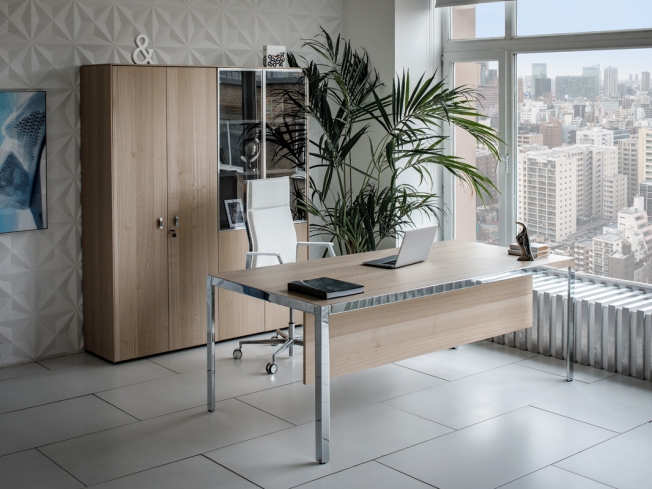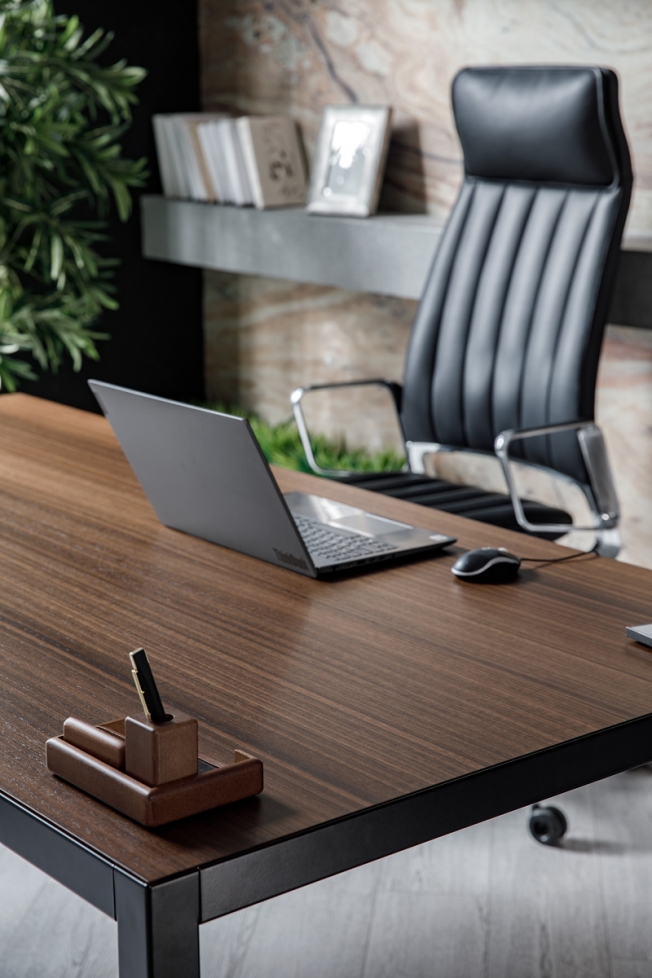 В основе концепции стола Enzo – минималистичная металлическая рама, в которую встроена столешница из шпонированного МДФ. Конструкция и опоры с треугольным сечением из металлического профиля обеспечивают максимальную устойчивость и прочность.