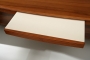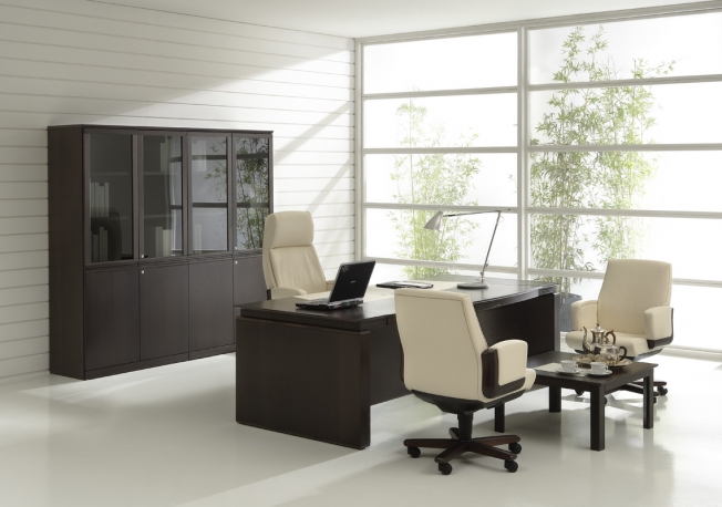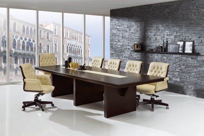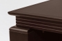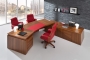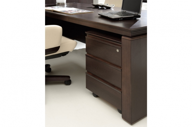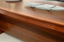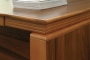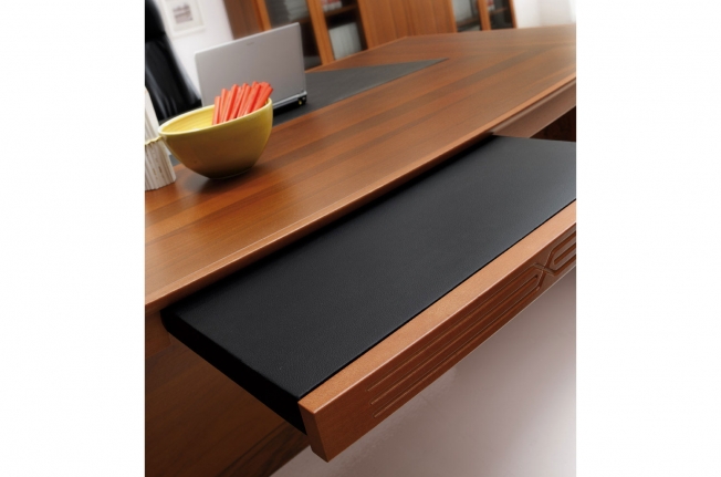 Резная кромка письменного стола — массив ценной породы дерева Кото. У столов длиной 230 см часть столешницы, выполненная из тамбурата, оснащена выдвижным ящиком для канцелярских принадлежностей. Опоры выполнены из тамбурата толщиной 90 мм с завершающими панелями из массива дерева толщиной 19 мм с закруглением радиусом 15 мм.