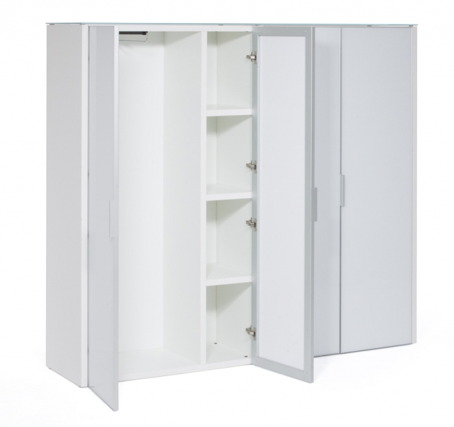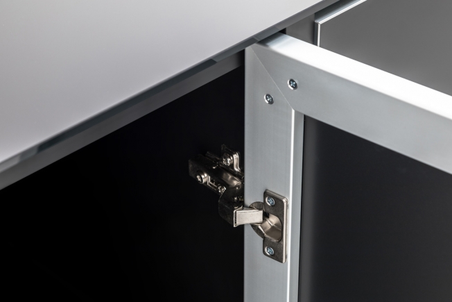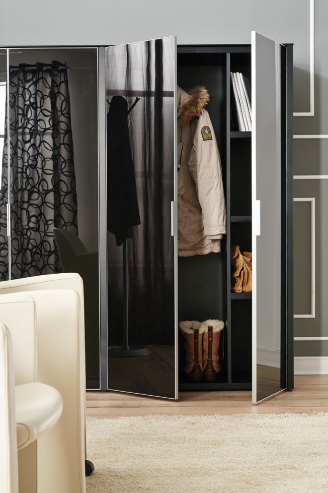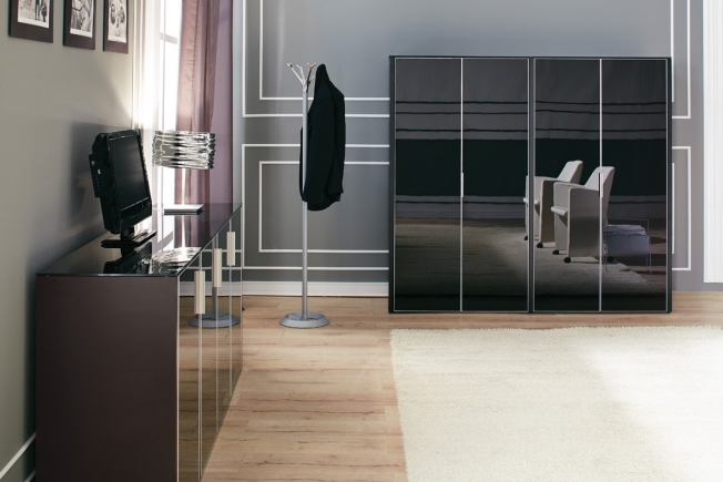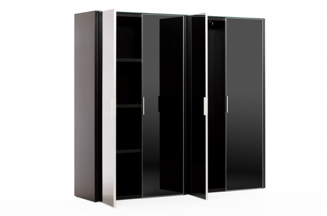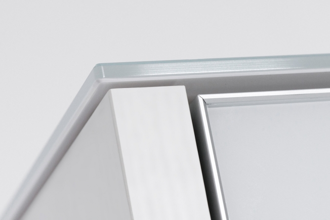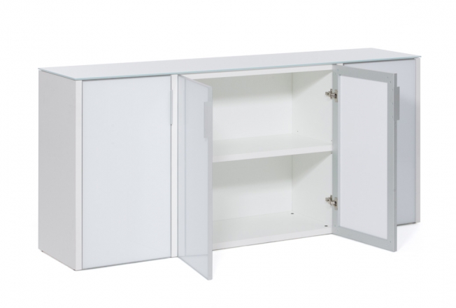 Стеклянные двери систем хранения Gala выполнены из стемалита (Стемалит — сверхпрочное закаленное эмалированное стекло) толщиной 4 мм черного или белого цвета в алюминиевой раме. Двери оснащены механизмом плавного закрывания. Все шкафные композиции укомплектованы топом из стемалита толщиной 8 мм.