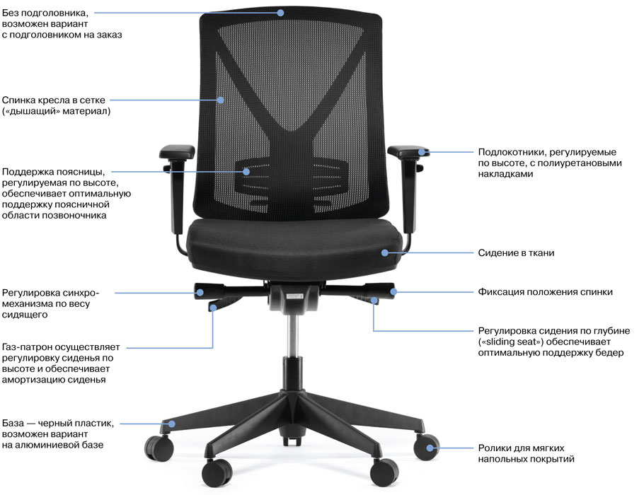 Механизм, удерживающий спинку и сиденье под правильным углом, изменяющий угол наклона всего сиденья. Спинка и сиденье постоянно следуют за движениями тела, обеспечивая правильное положение. Сила противодействия регулируется в зависимости от веса сидящего (45-120 кг).