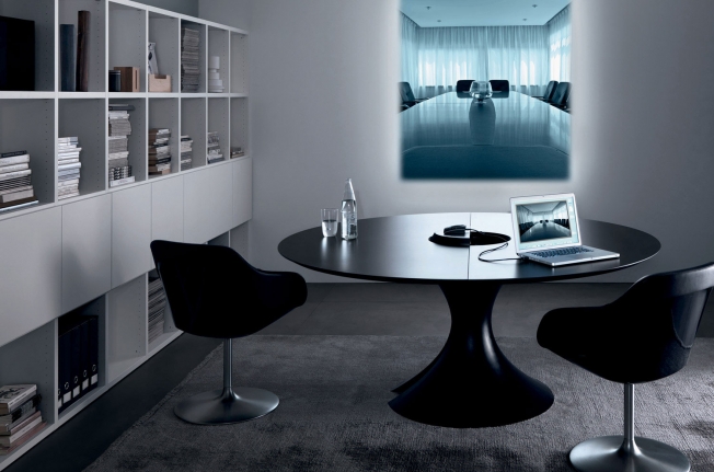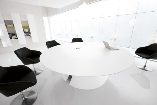 В складской программе представлены два варианта столов для переговоров: круглый — с черной глянцевой опорой, овальный — с белой глянцевой опорой; оба стола — со шпонированной столешницей в цвете орех.