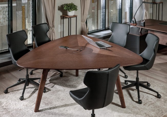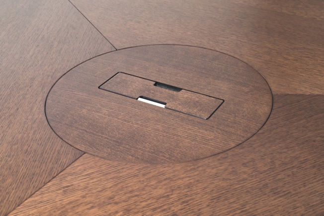 Столы для переговоров оснащены коробом для размещения электрификации. В центре столешницы электрификационный лючок со шпонированной в цвет столешницы крышкой (с двусторонним открыванием).