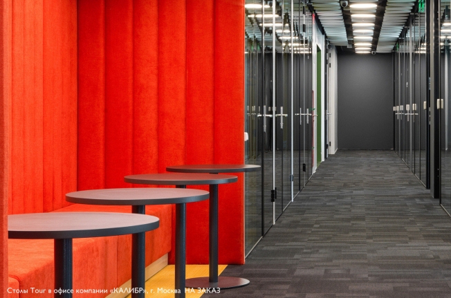 В коллекциях Tour Wood и Tour Metal используется прямоугольный стол для переговоров размером 200х100 см на металлических опорах, оснащенных компенсаторами неровности пола ±15 мм. Толщина топа стола — 25 мм. Для небольших переговорных подойдет круглый стол на одной опоре.